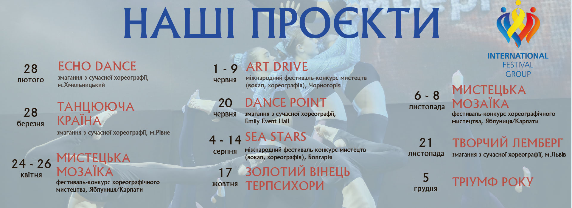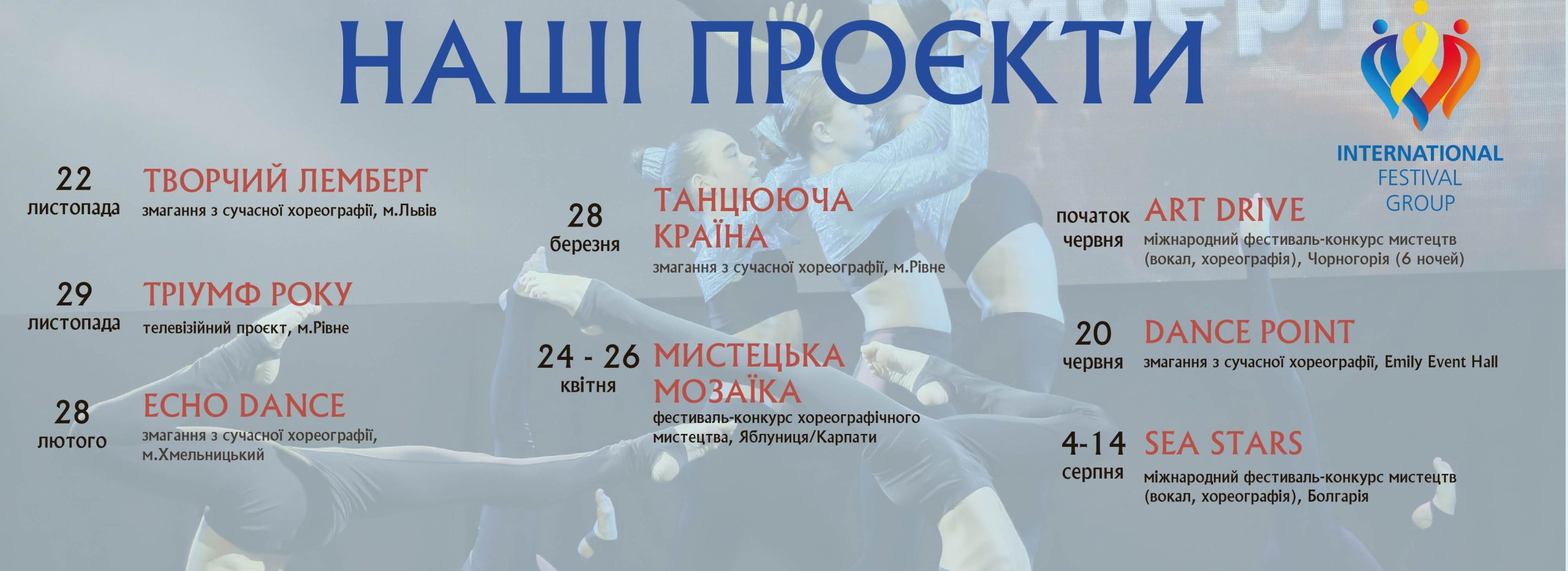 Участь у фестивалях та конкурсах, що ми організовуємо, - це не тільки можливість продемонструвати свої творчі досягнення на європейських і світових концертних майданчиках, а й надзвичайно цікава мандрівка, можливість познайомитися з культурою та історією різних міст і країн.